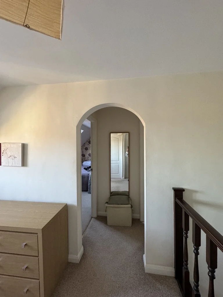 Before: A generous landing with so much potential, furniture that had gathered rather than been placed, and a dated archway that broke up the flow of a space that was simply passing through.