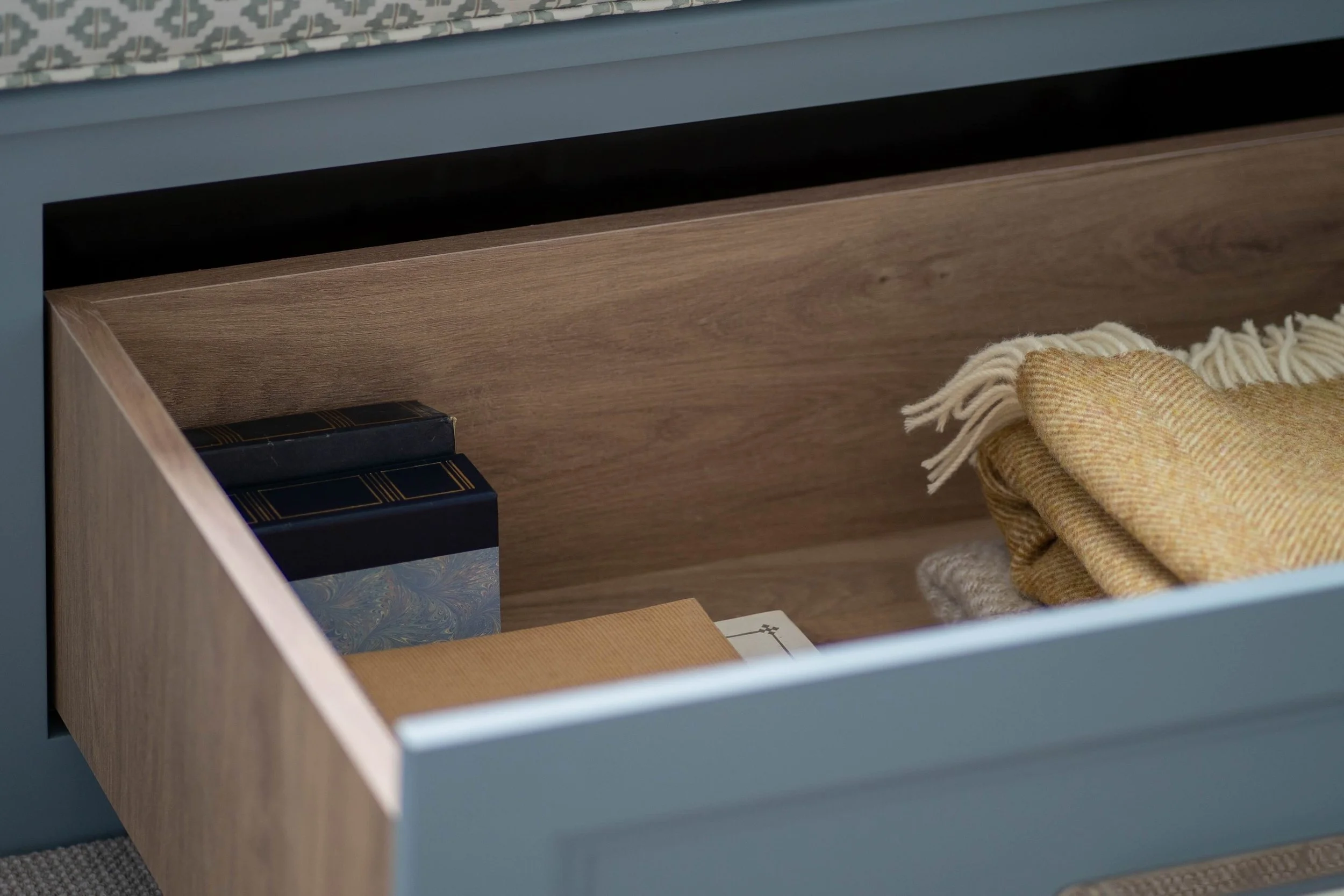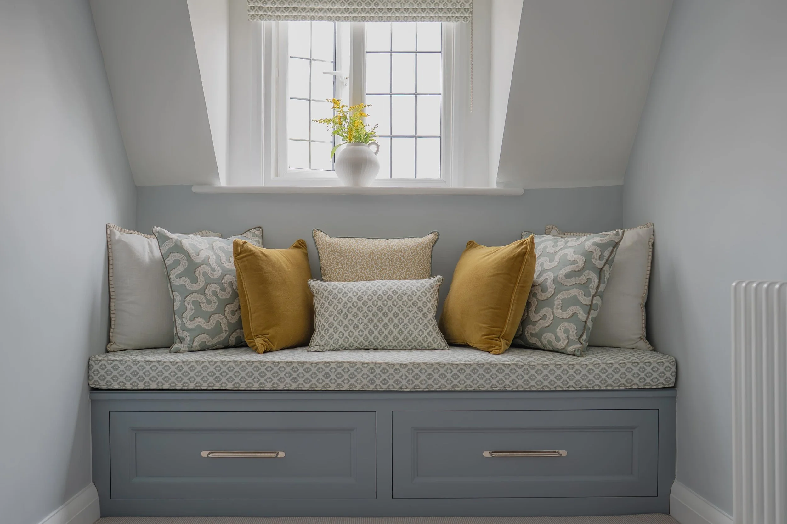 As part of a wider hall, stairs, and landing redesign using our Signature Coordination Service, this forgotten space was transformed into a place to sit and enjoy the natural light, with storage that keeps life out of sight, a calm, inviting space to pause, relax, and enjoy.